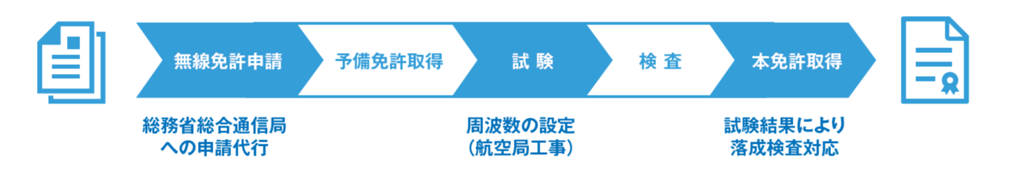 総務省総合通信局への申請代行、周波数の設定・航空局工事、試験結果に応じた落成検査対応