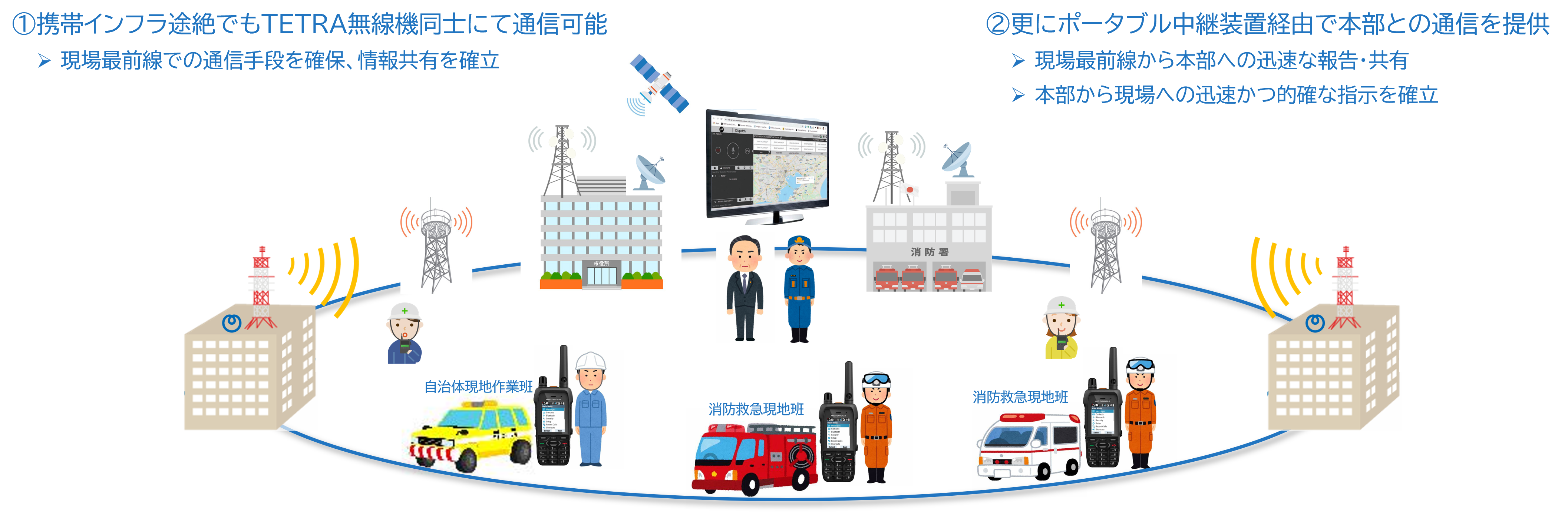 携帯インフラ途絶の場合でも、臨機の措置によるTETRAの活用により、現場と本部間の通信環境を構築、現場と本部との迅速な情報共有を強力に支援